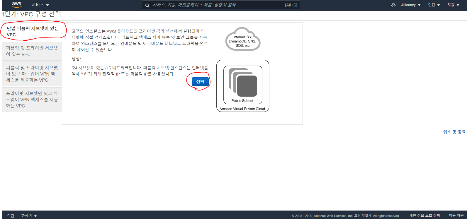 [VPC 구성 선택] 페이지에서 '단일 퍼블릭 서브넷이 있는 VPC'를 선택후 [선택]을 누른다.