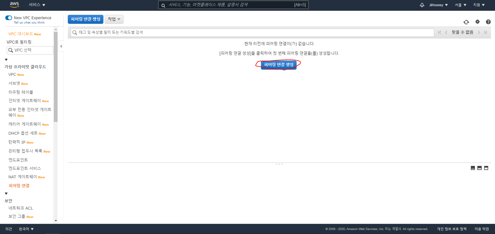 그리고 왼쪽 탭에서 [피어링 연결] 메뉴를 누른 뒤 [피어링 연결 생성] 버튼을 클릭한다.