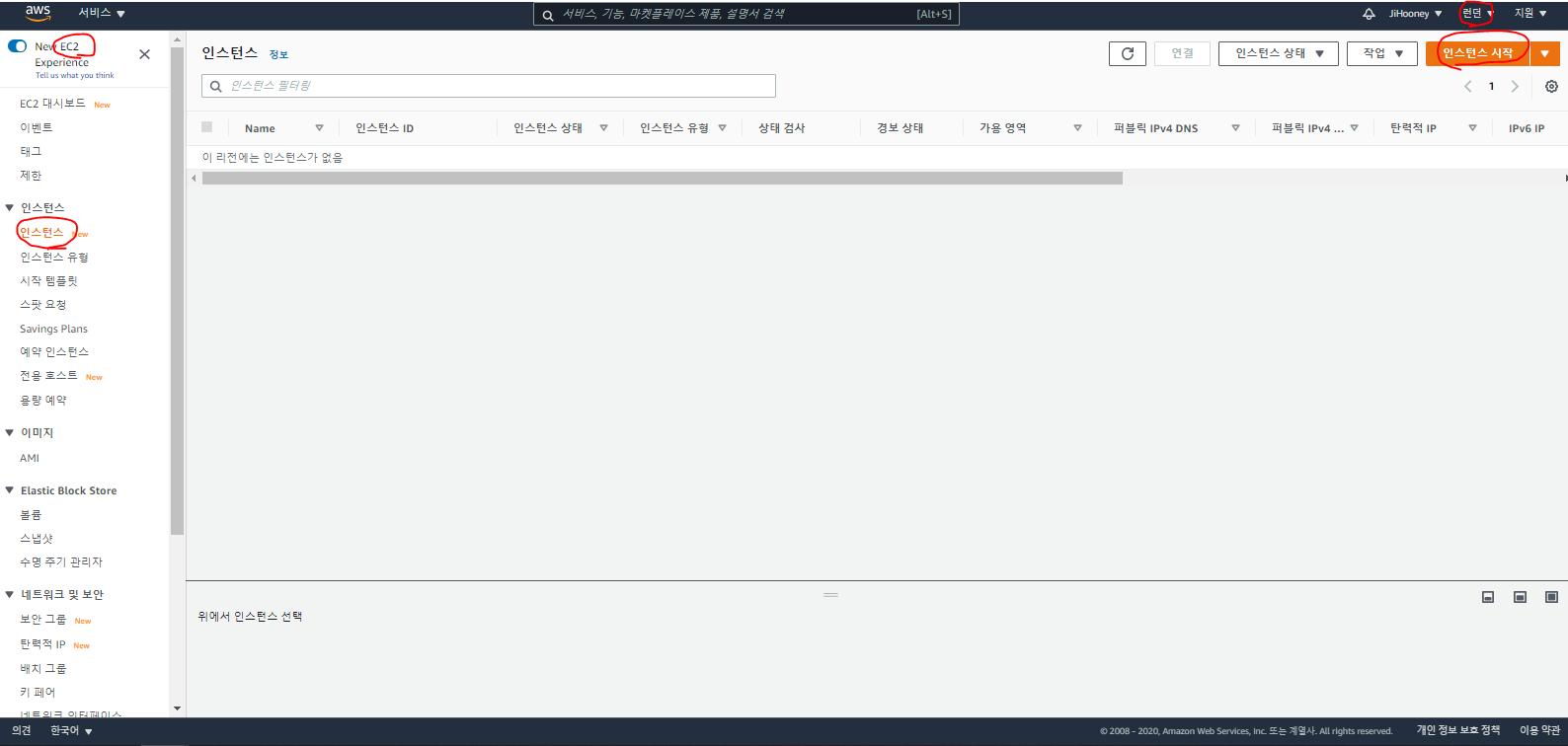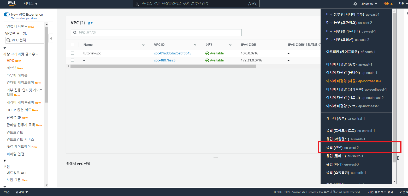 1. 아마존에 접속해서 로그인한 뒤 오른쪽 상단에 [리전 선택]에서 '유럽런던' 리전을 클릭한다.