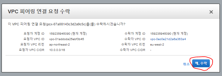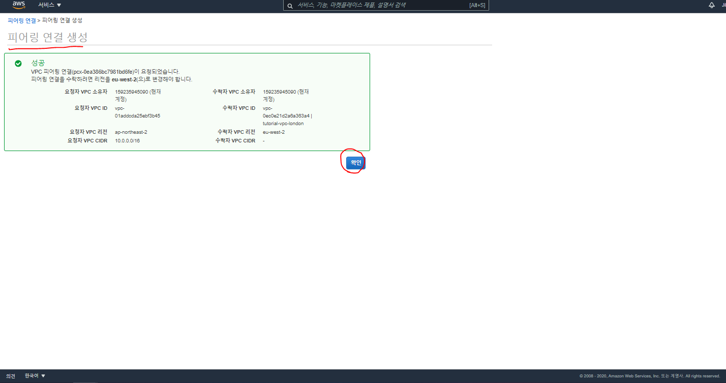 아래와같이 연결이 성공하면 피어링 연결 승인을 위해 런던 리전으로 이동한다.