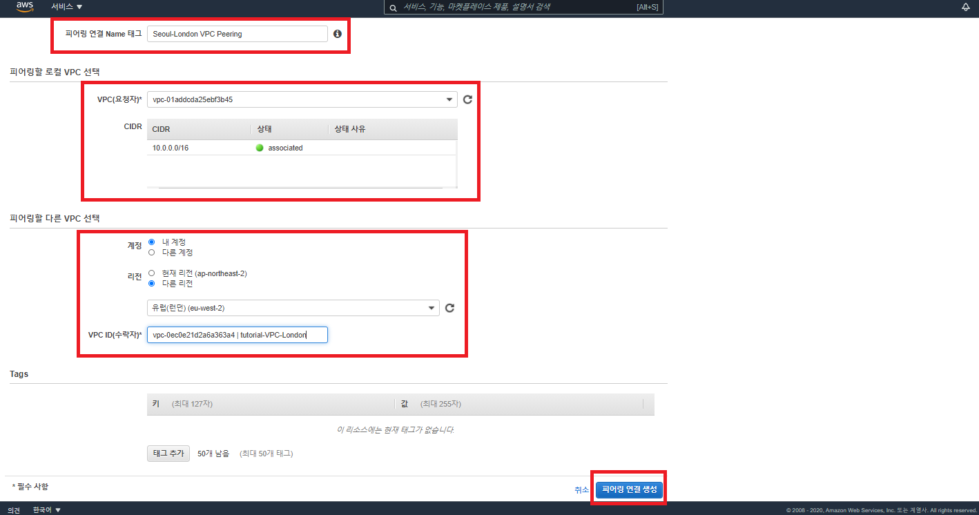 VPC 수락자에서 " | tutorial VPC London"은 뻬야한다.