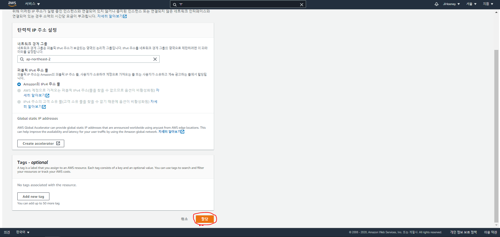 그리고 [탄력적 IP 주소 할당] 에서 [할당]을 클릭한다.