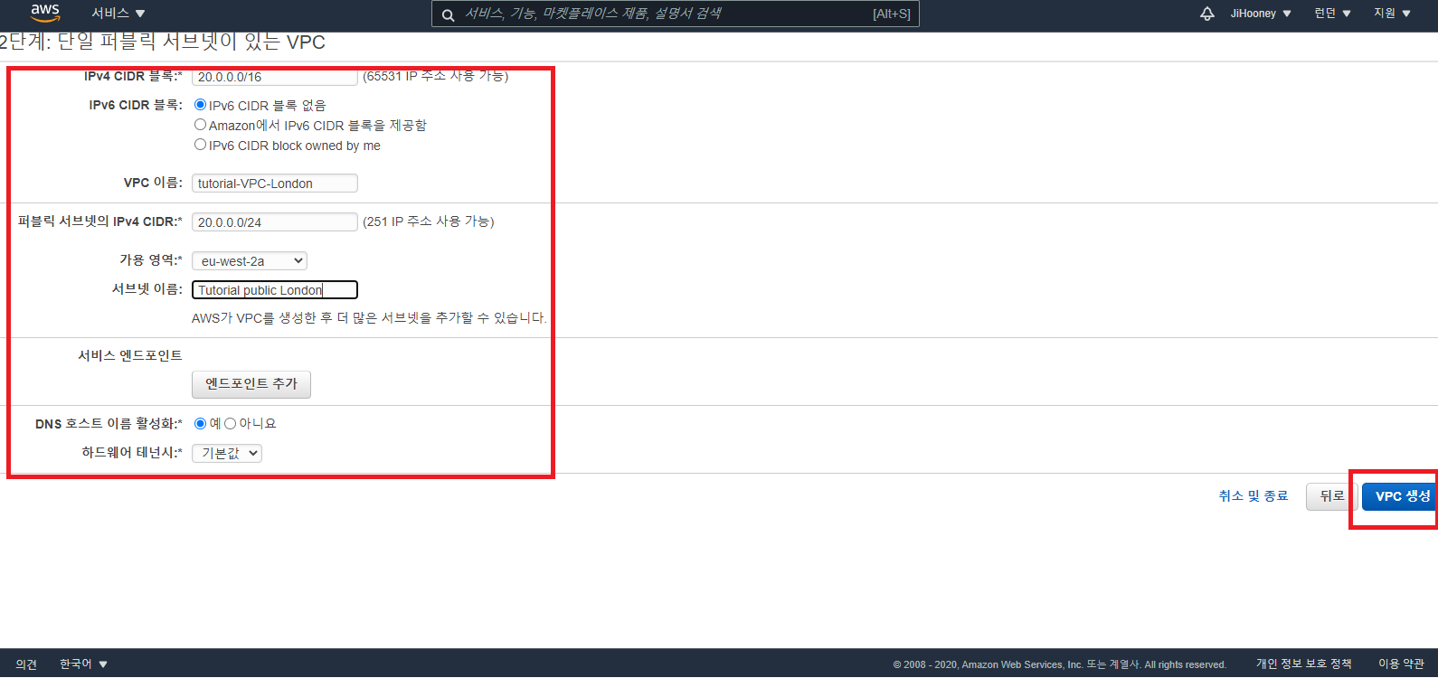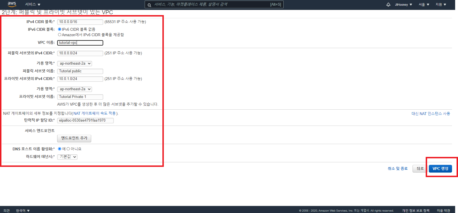 5. VPC 구성을 위해 다음과 같이 입력후 [VPC 만들기] 버튼을 클릭해서 VPC를 생성한다.