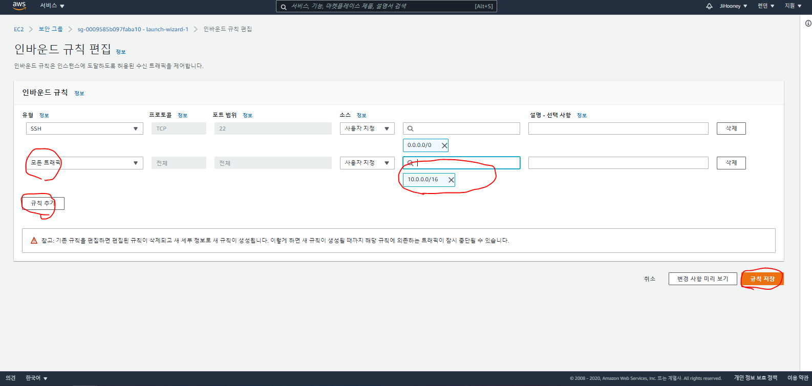 14. 보안 그룹 페이지 하단의 "인바운드 규칙"에서 [인바운드 규칙 편집]을 클릭하여 인바운드 규칙 편집 페이지로 이동후 [규칙 추가] 버튼을 클릭하여 "유형 : 모든 트래픽, 소스 : 10.0.0.0/16(서울 리전 VPC 대역)"등록후 [규칙 저장]을 클릭한다.