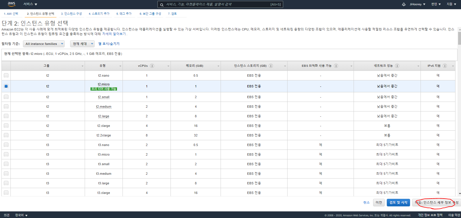 12. 다시 런던 리전의 EC2 생성 페이지로 이동후 "Amazon Linux AMI ~"를 선택하여 t3.micro(Free-Tire) 선택후 인스턴스 세부정보 구성 페이지에서 VPC 선택시 이전에 생성했던 VPC를 선택한다.