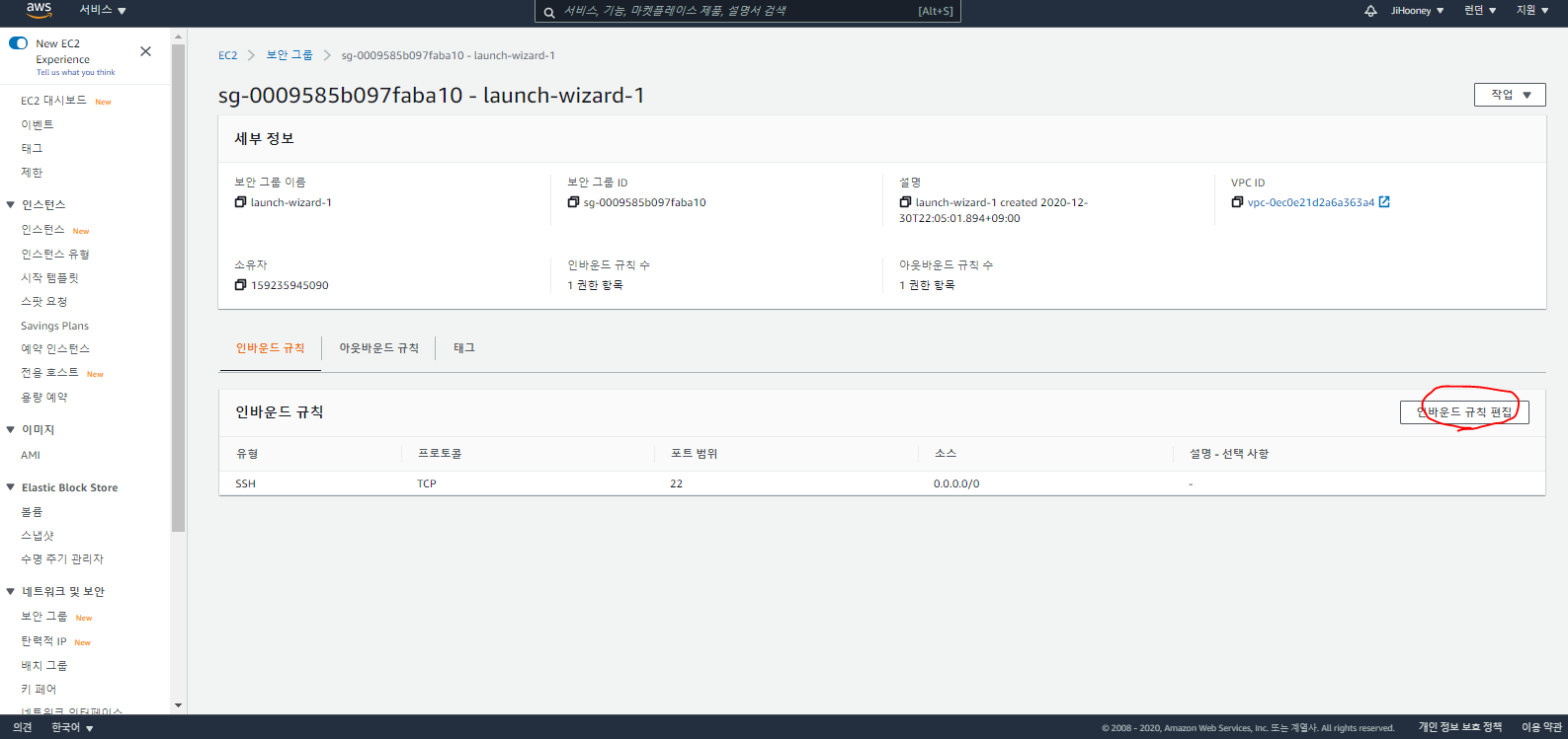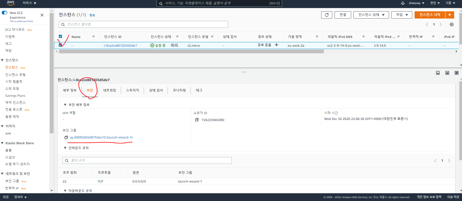 13. 런던 리전에서 인스턴스 생성 완료 후 세부 항목 페이지에서 등록된 "보안 그룹"을 확인하고 수정을 위해 "보안그룹링크"를 클릭한다.