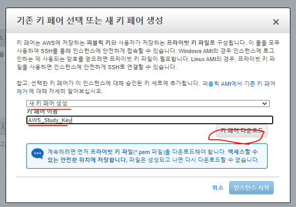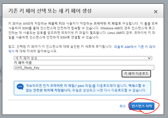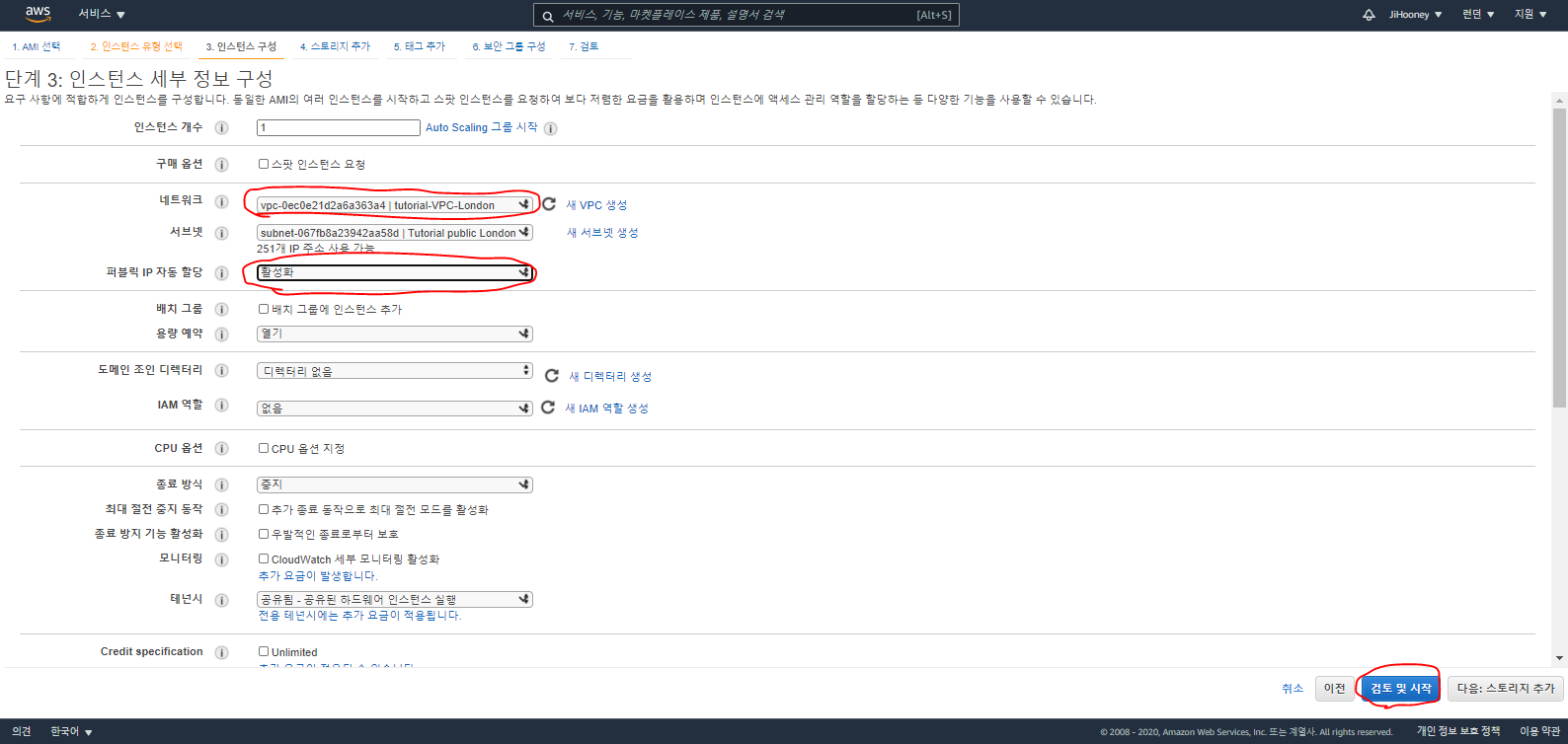 "퍼블릭 IP 자동 할당"을 "활성화"로 선택후 [검토 및 시작] 버튼을 클릭해 인스턴스를 생성한다.
