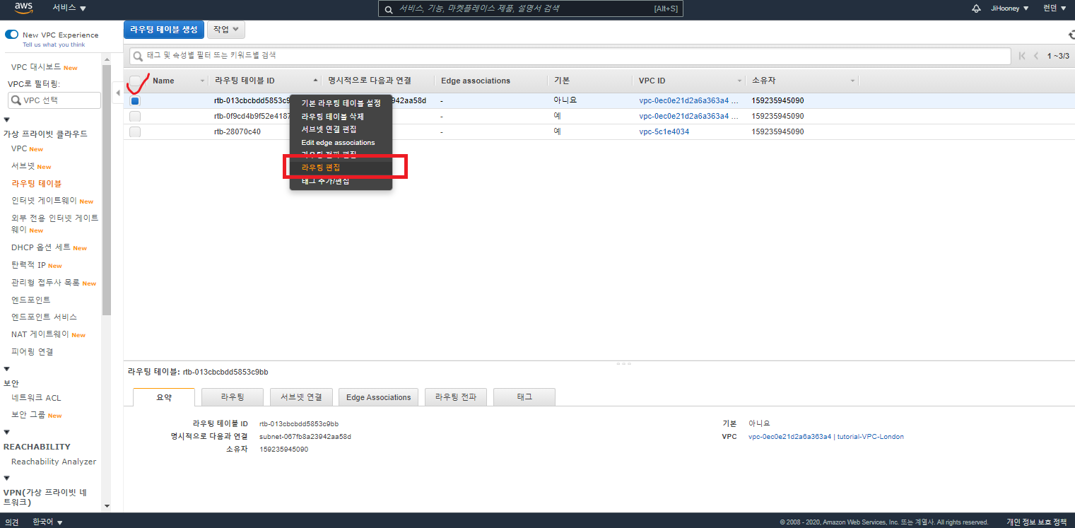8. 런던 리전의 [라우팅 테이블] 페이지에서 바로 전에 생성된 라우팅 테이블을 다음과 같이 선택하고, "라우팅" 탭 클릭후 [라우팅 편집] 버튼을 클릭한다.