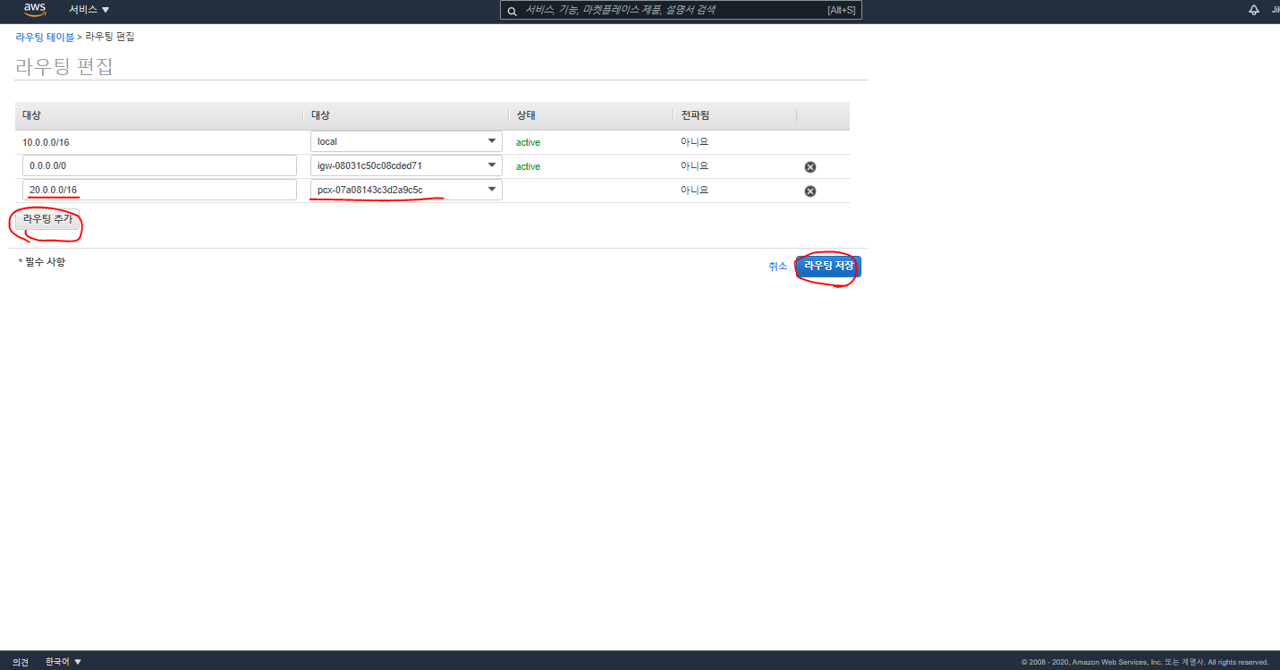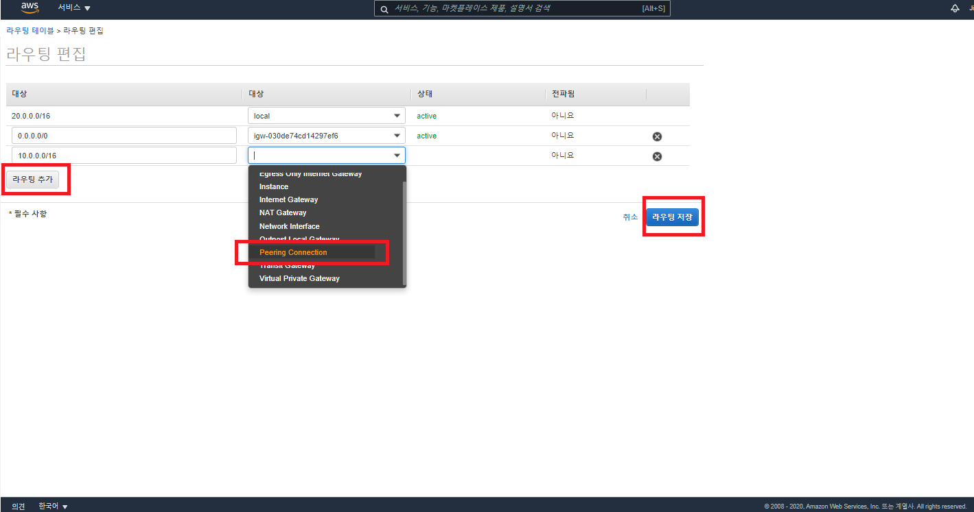 11. 라우팅 편집 페이지에서 [라우팅 추가] 클릭후 좌측의 "대상"에서 런던 리전의 VPC 대역인 "20.0.0.0/16" 입력후 대상항목에서 "Peering Connection"를 선택한다.