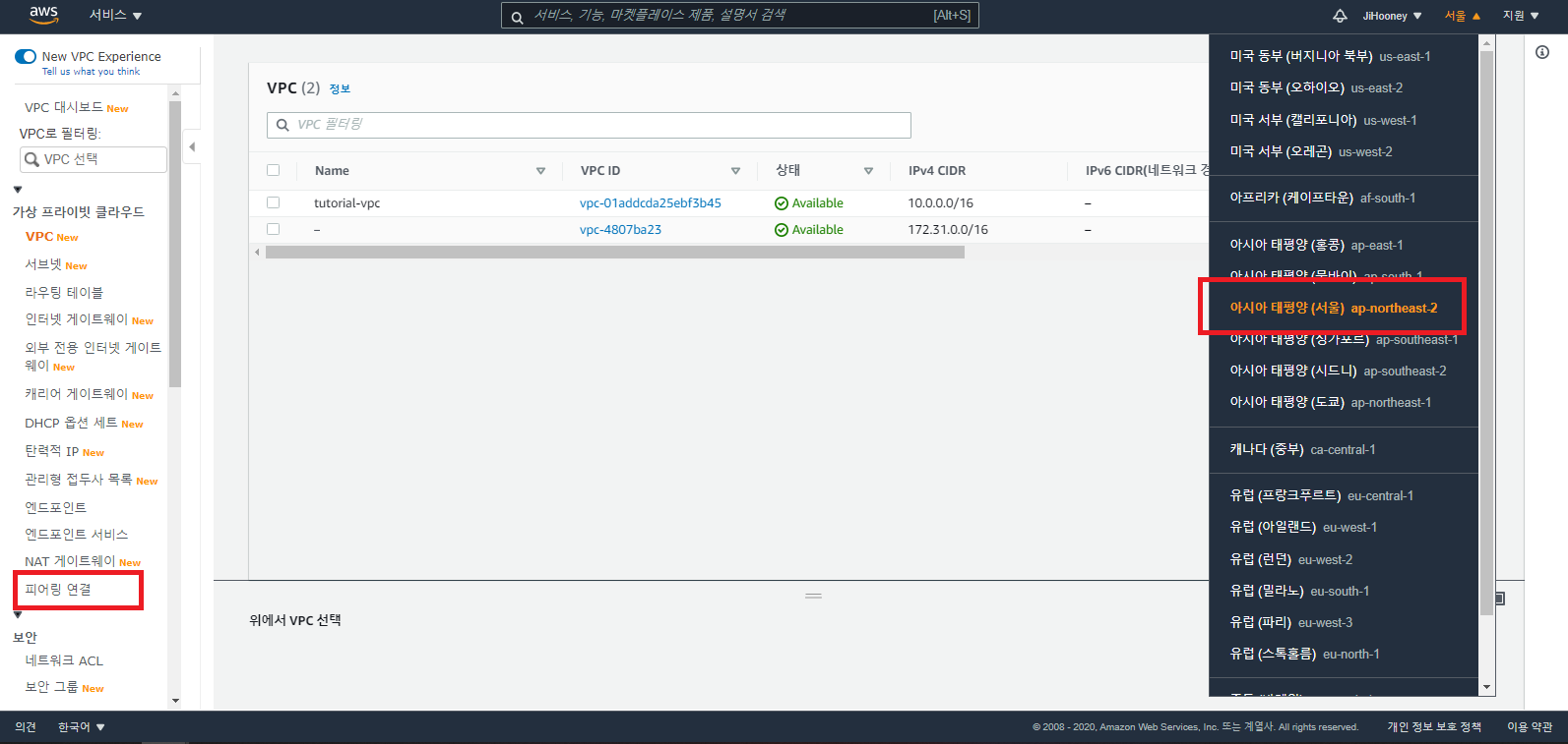 4. 피어링 구성을 위해 리전을 다시 '아시아 태평양(서울)' 로 전환 후 VPC로 이동한다.