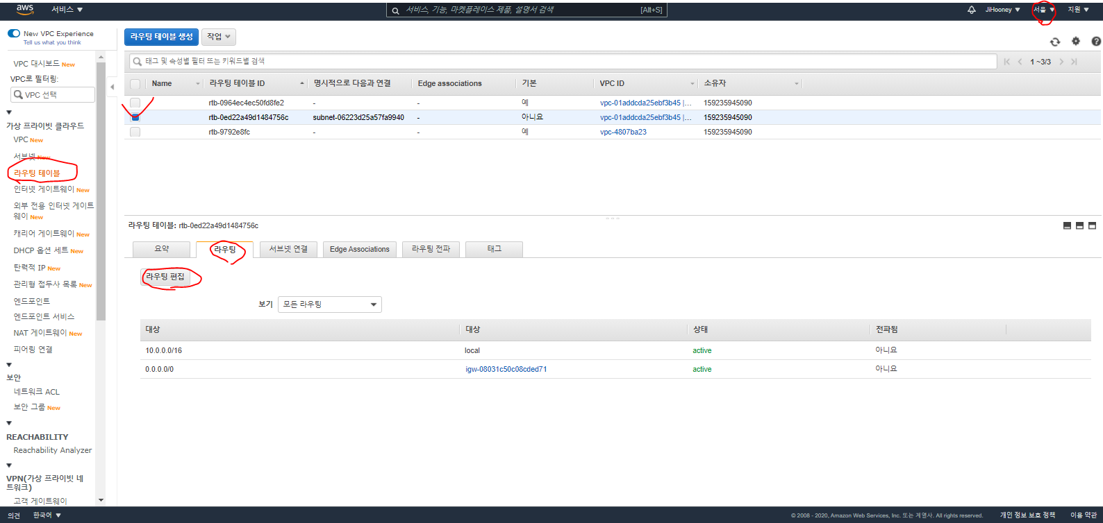 10. 서울 리전의 [라우팅 테이블] 페이지에서 바로 전에 생성된 라우팅 테이블을 다음과 같이 선택하고 "라우팅"탭 클릭후 [라우팅 편집] 클릭한다.