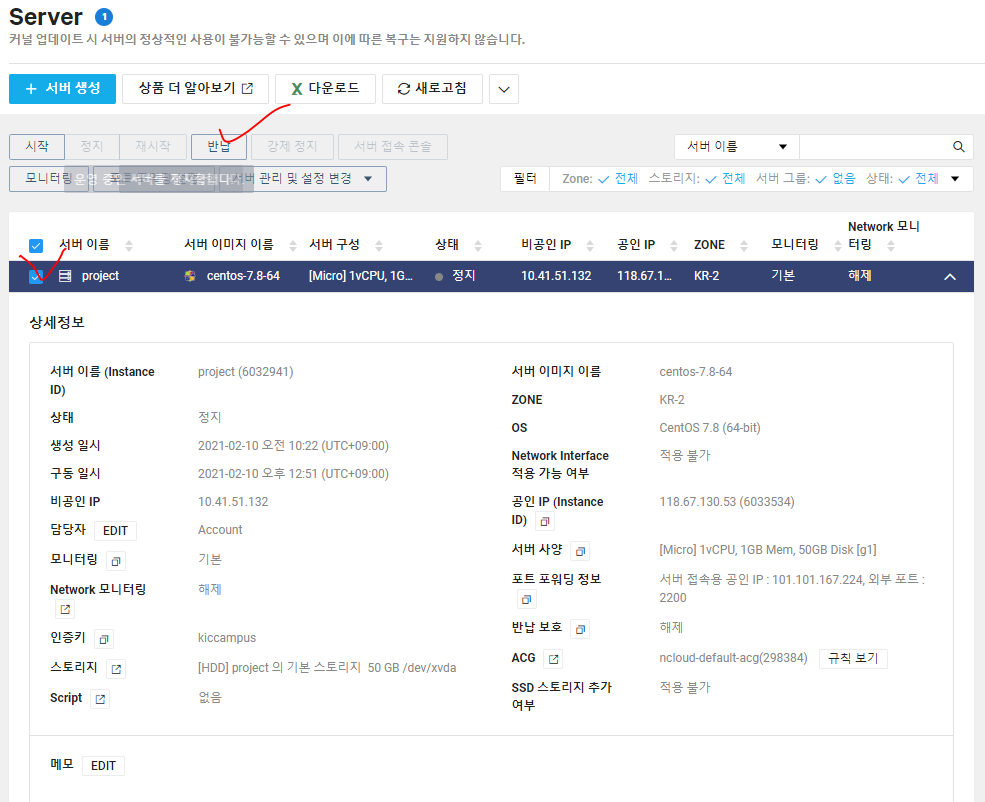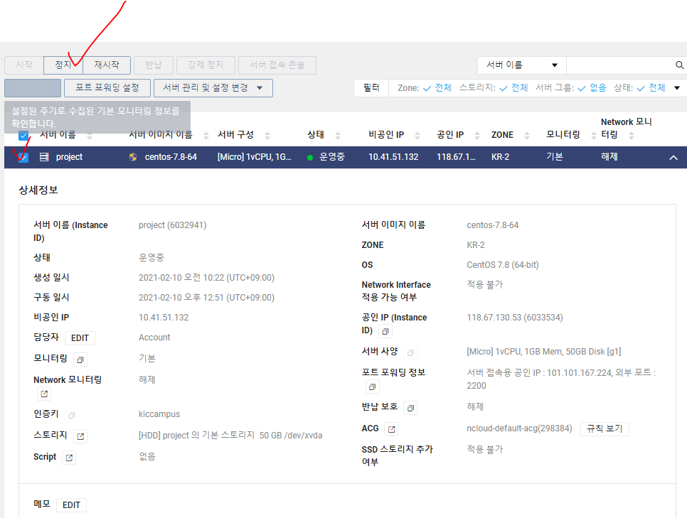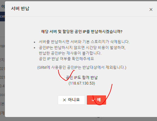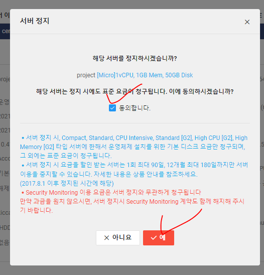 작업을 끝냈을 때는 다시 공인IP반납하고 서버도 정지하고 반납해야지 요금이 청구되지 않는다.