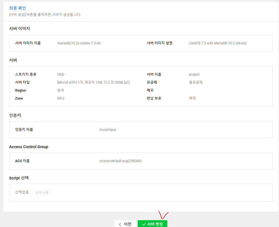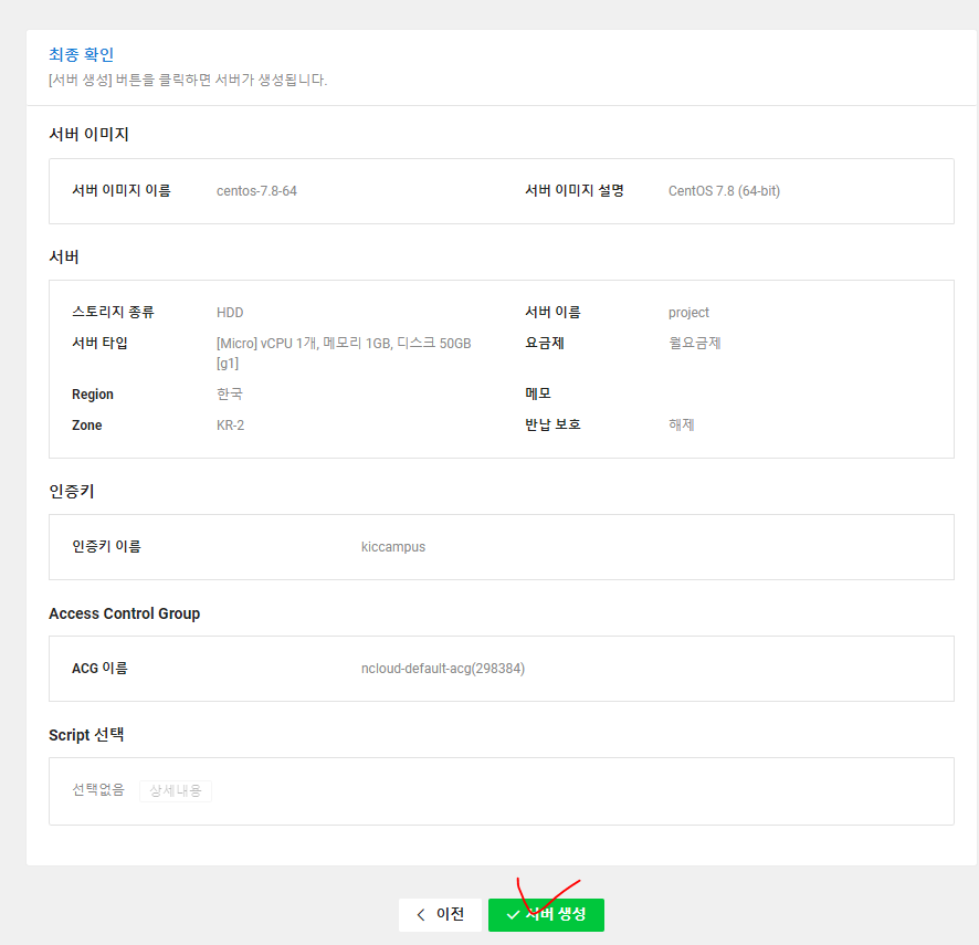 9. 클라우드 설정에 대한 요약이 나온다. 서버 생성을 누른다.