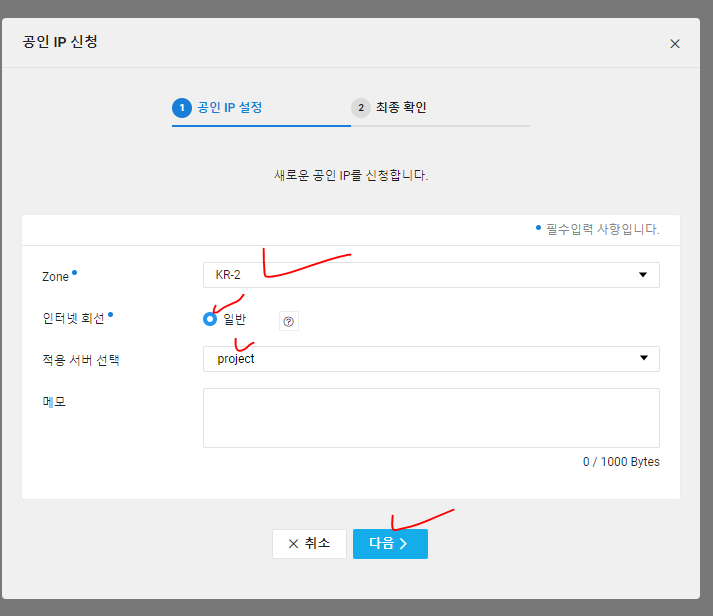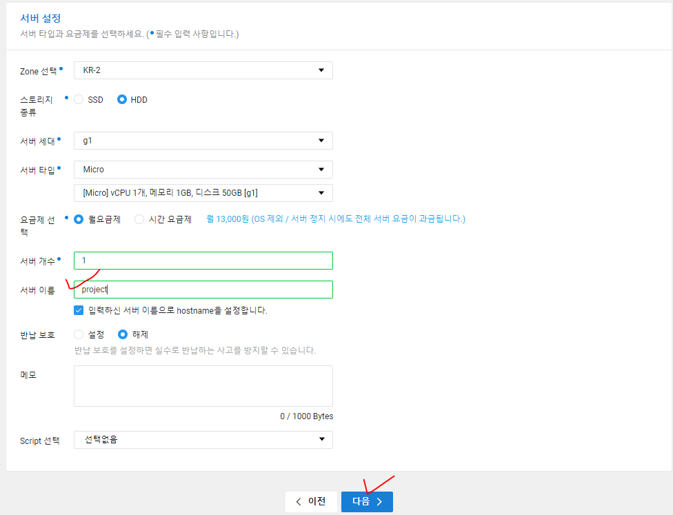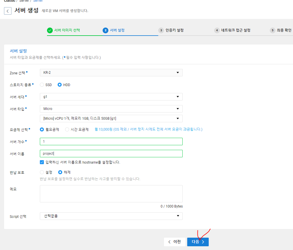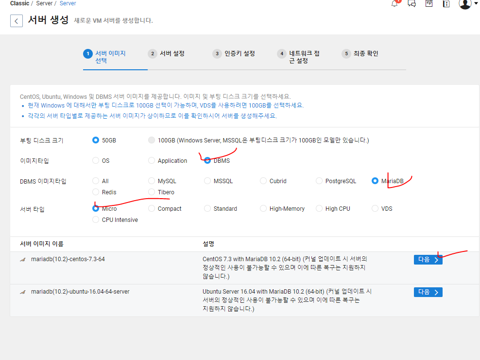 디스크 크기, 이미지 타입, 리눅스 종류, 서버 타입 등