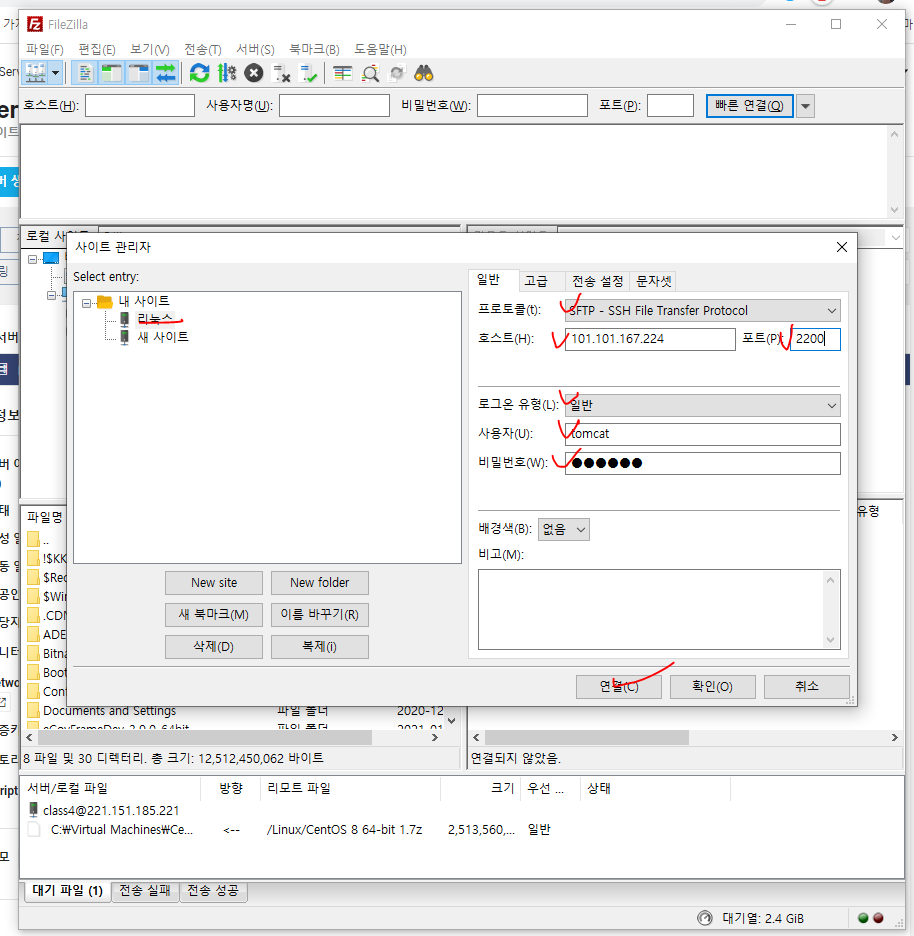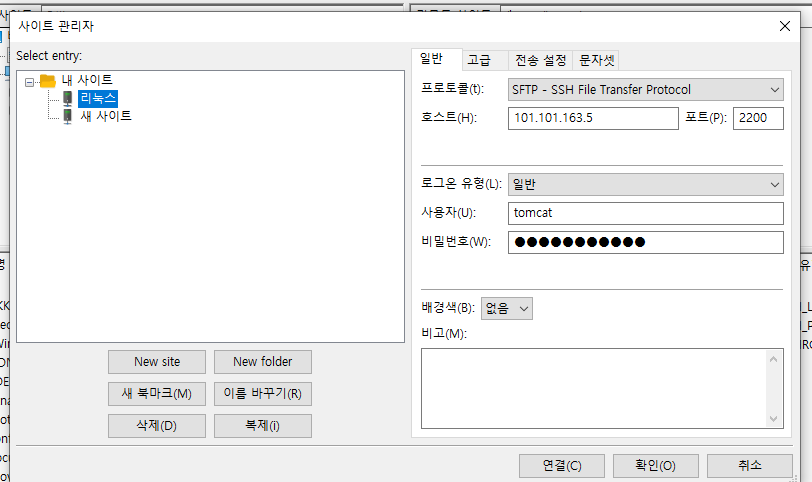 파일질라 ftp에서 아래처럼 설정하고 연결한다.