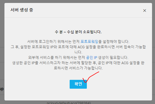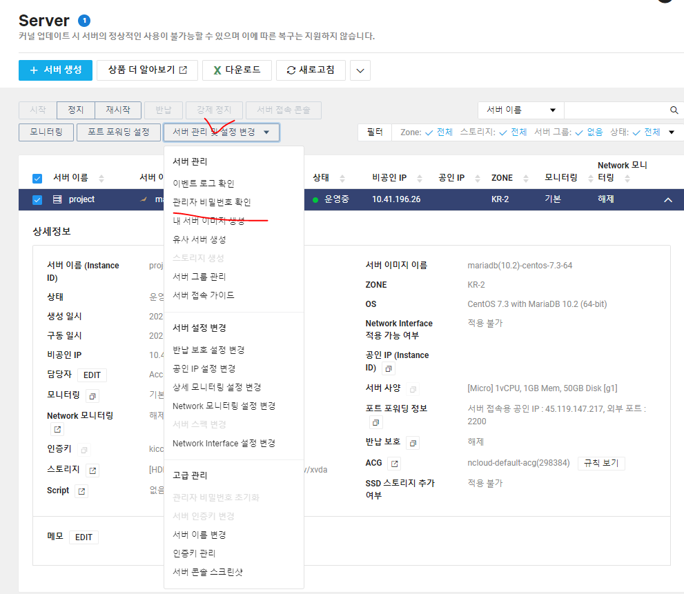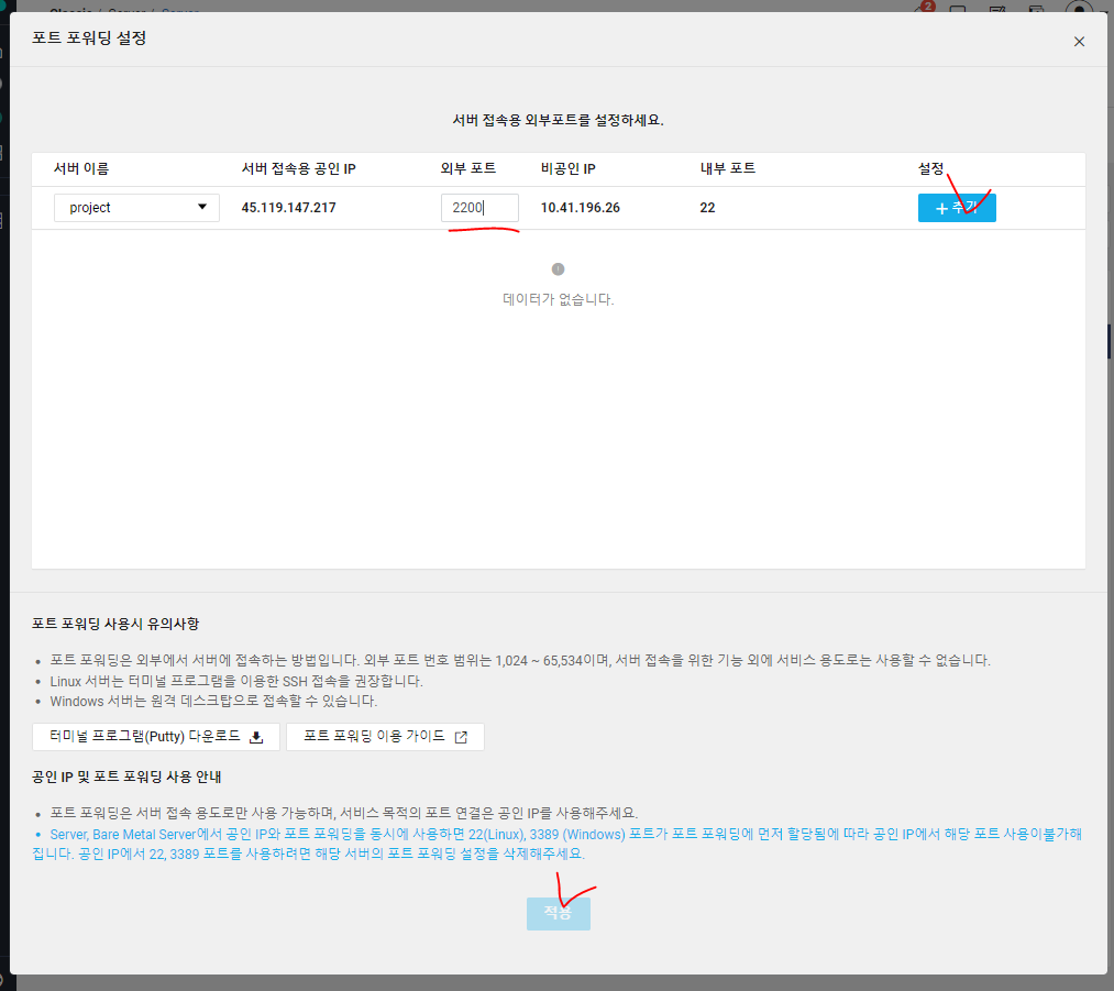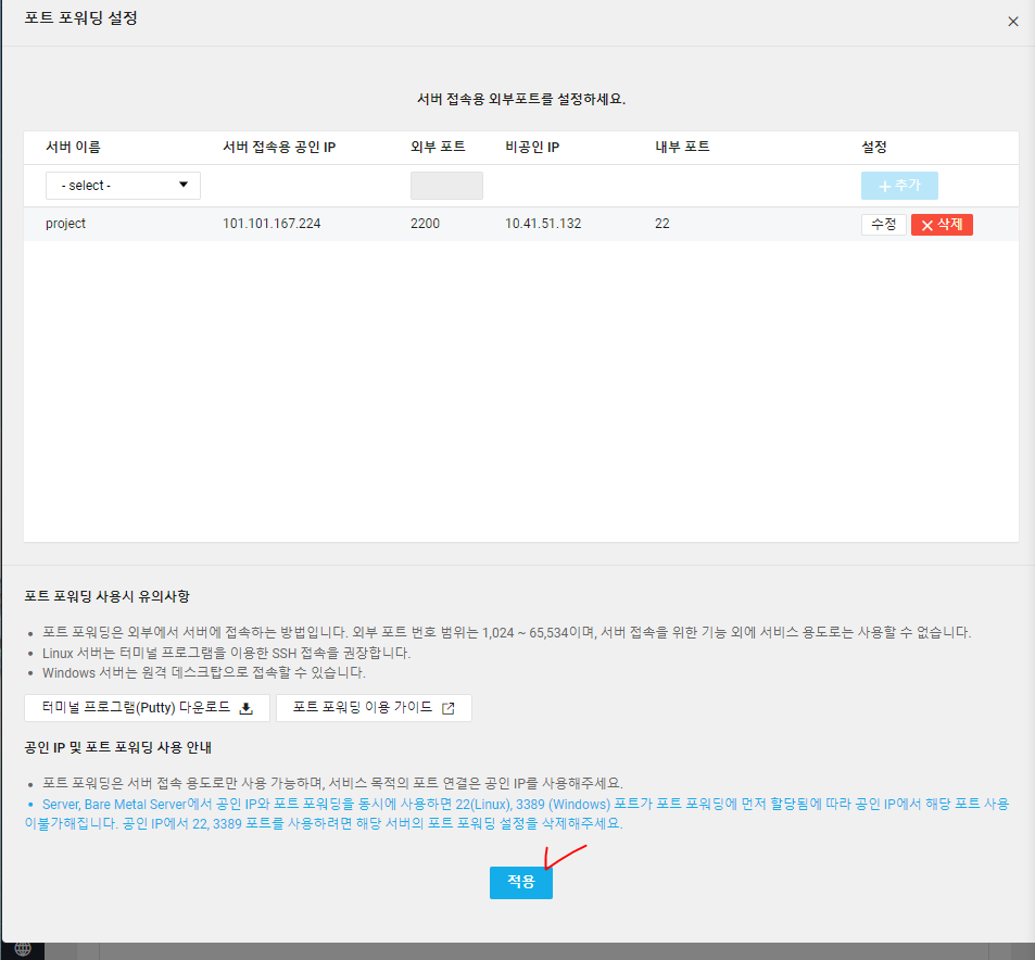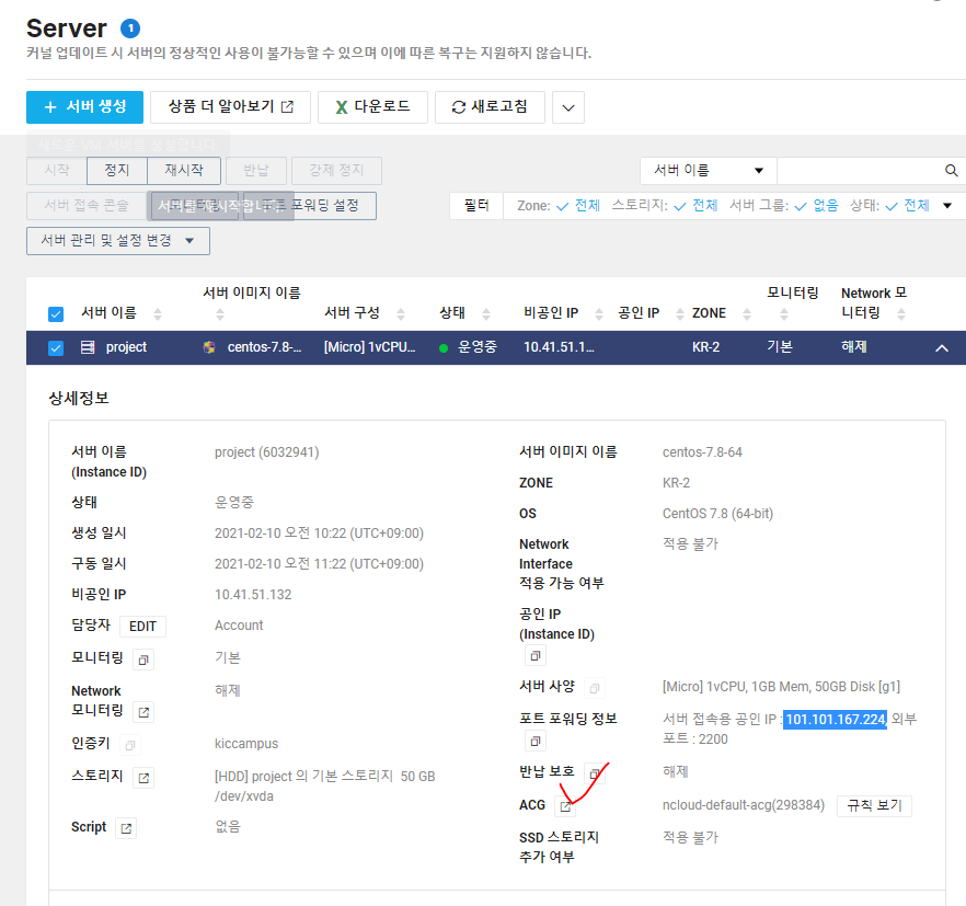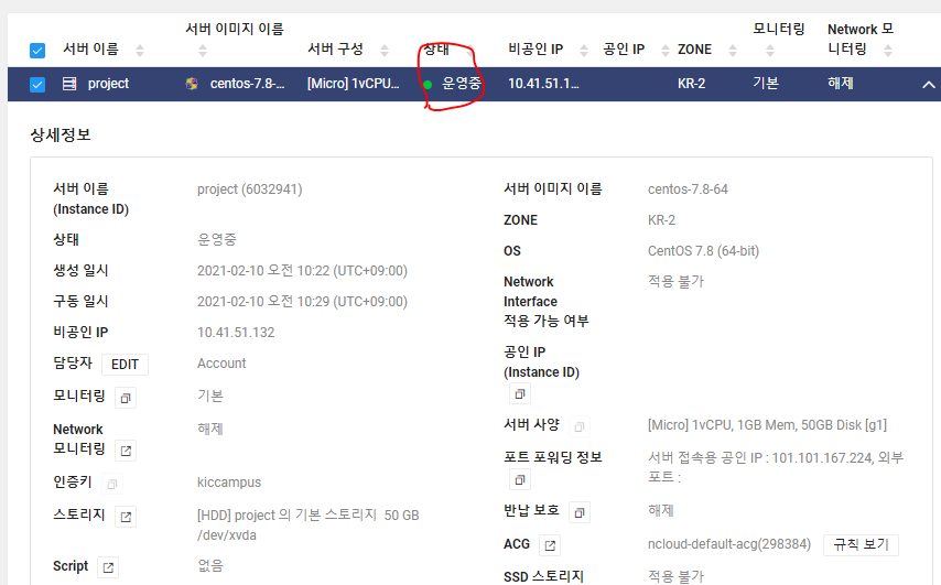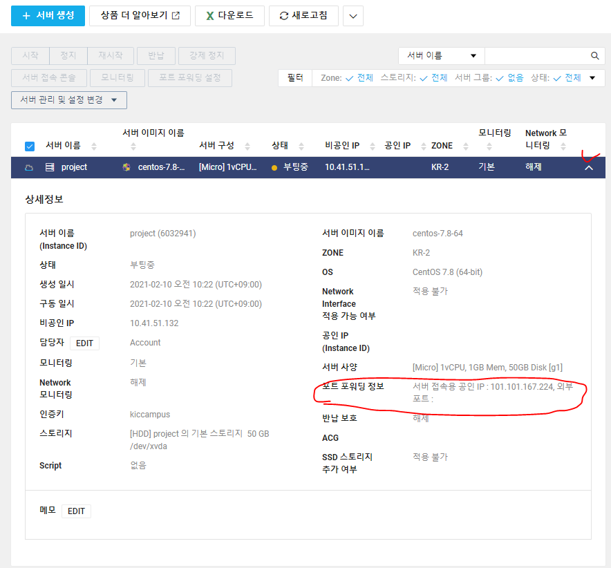 * 외부에서 클라우드 서버에 접속하려면 포트 포워딩 정보인 서버 접속용 공인 IP를 알아야 한다.