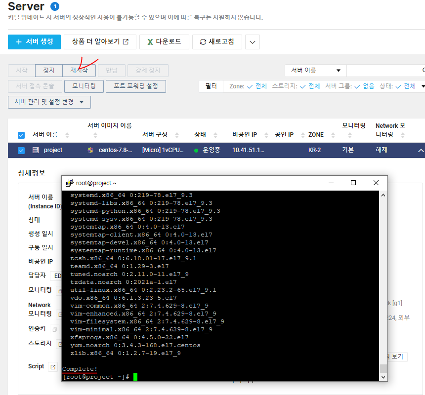 #기본 리눅스 업데이트, 업데이트 종료후 클라우드서버 재시작