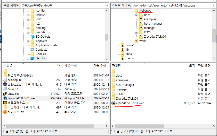 다음으로 윈도우 이클립스에서 만들었던 우편번호 검색기 war파일을 ftp를 통해서 가져온다.