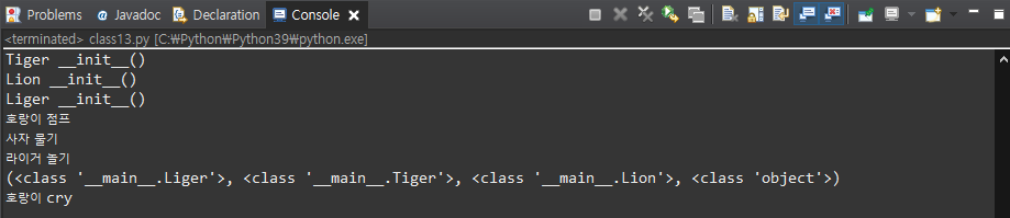 상속받는 순서를 Lion, Tiger로 바꾸면 Lion의 cry메서드가 불러진다.