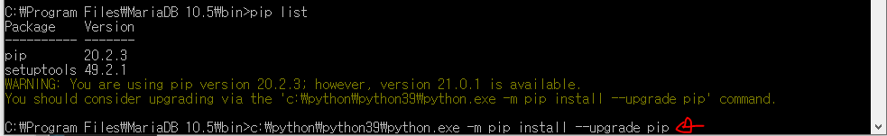 설치후에 다시 pip list를 하면 python pip를 설치하라는 내용이 사라진다.