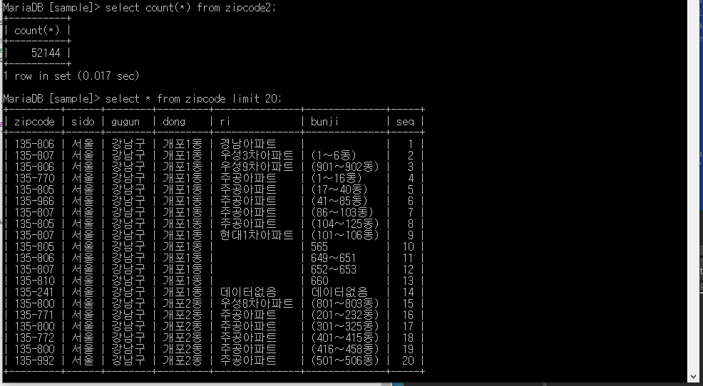실습) 우편번호 검색기 mariaDB에 집어넣기