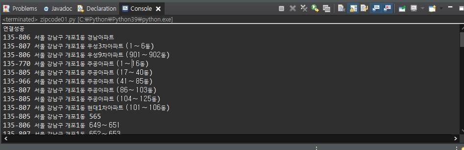for( zipcode, sido, gugun, dong, ri, bunji ) in cursor: #해당 컬럼명의 데이터들이 cursor안에 담겨져 나온다.