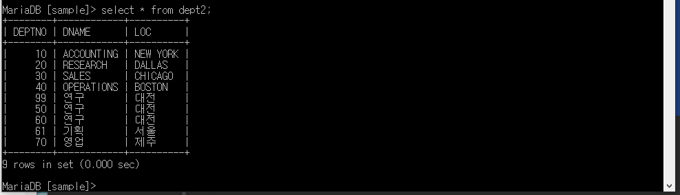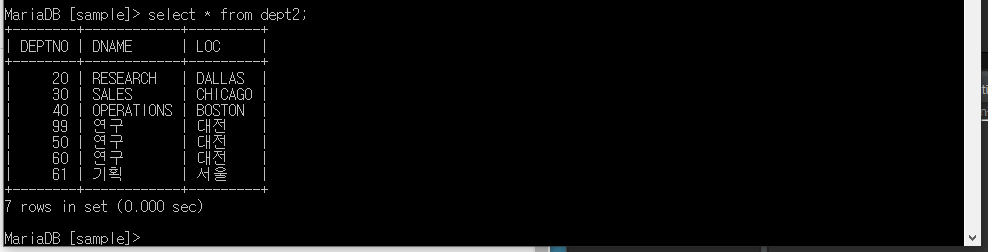 기존 MariaDB에 있는 dept2테이블에 데이터를 입력해보자.