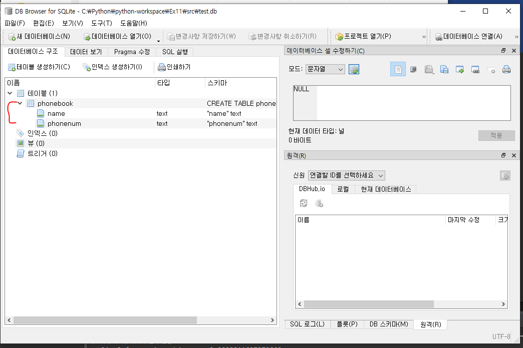 파일 -> 데이터베이스 열기 -> 위에서 만든 test.db 불러오기