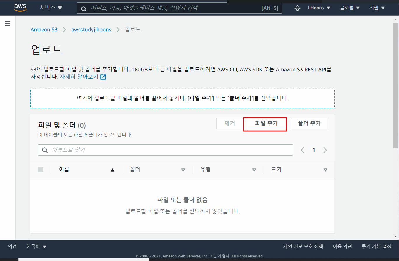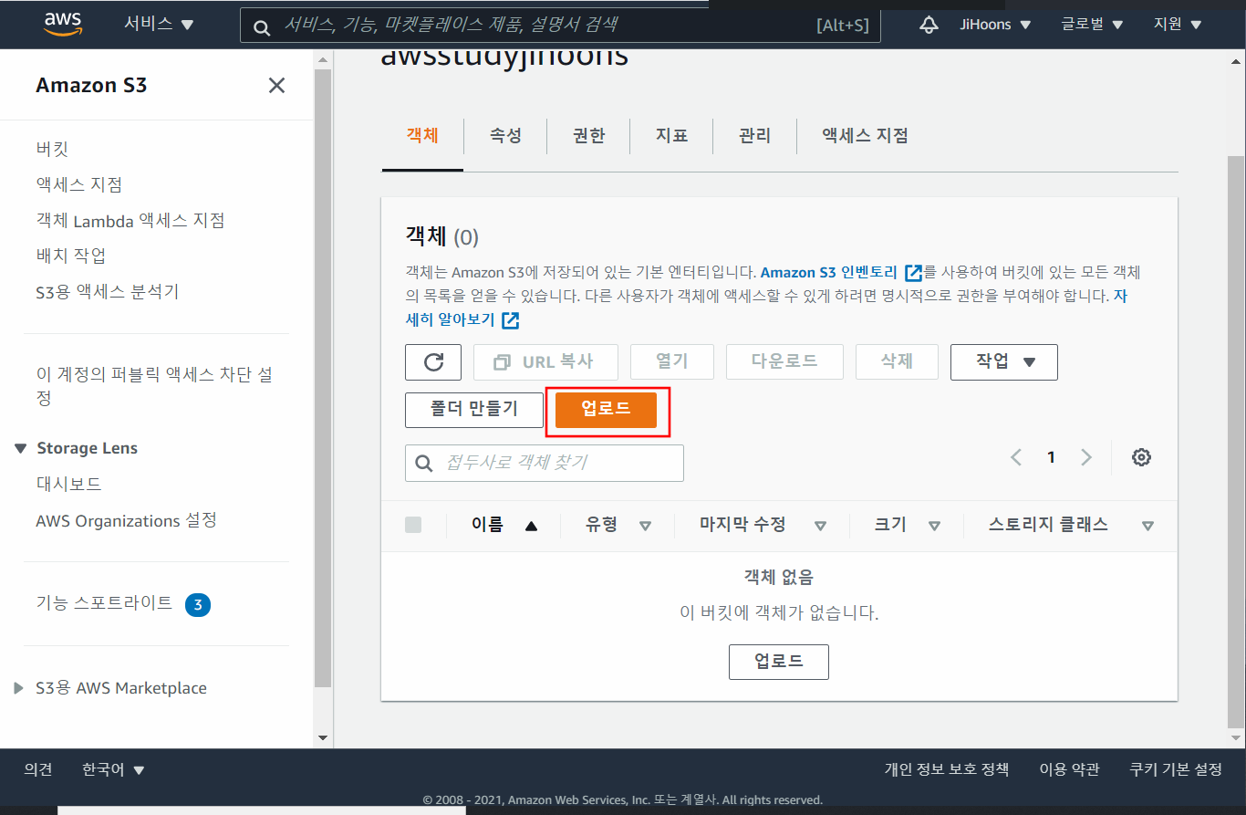 이제 버킷이 만들어졌고 이 버킷안에 폴더를 만들거나 파일을 업로드할 수 있다.
