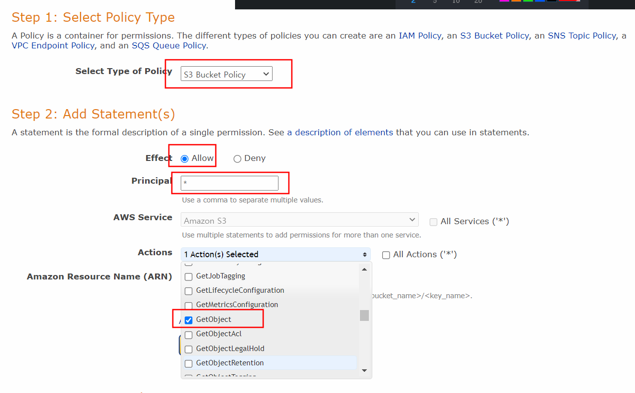 S3버킷 정책, 권한 허용, Principal(권한을 사용할 사용자) : * 모두,