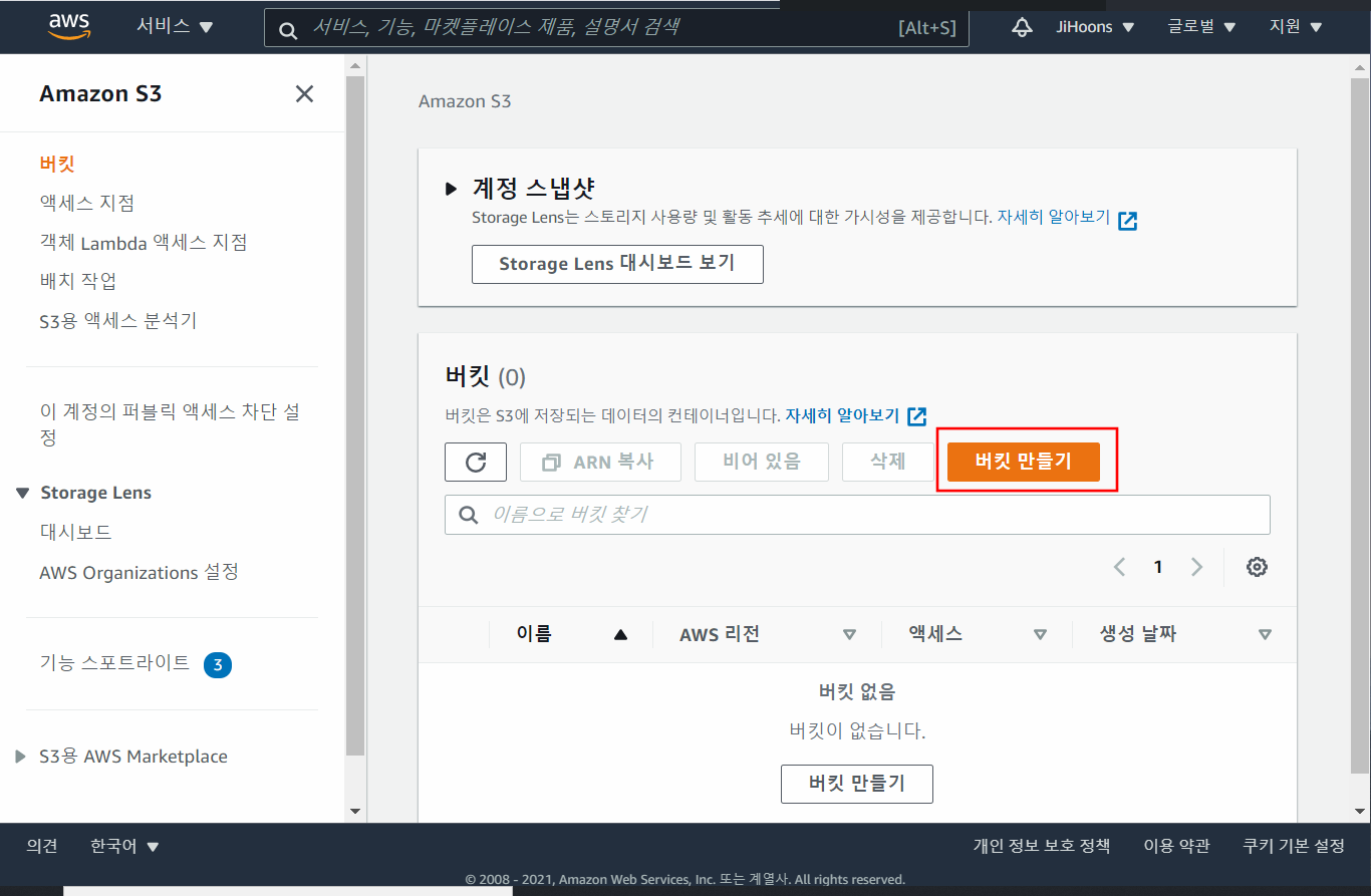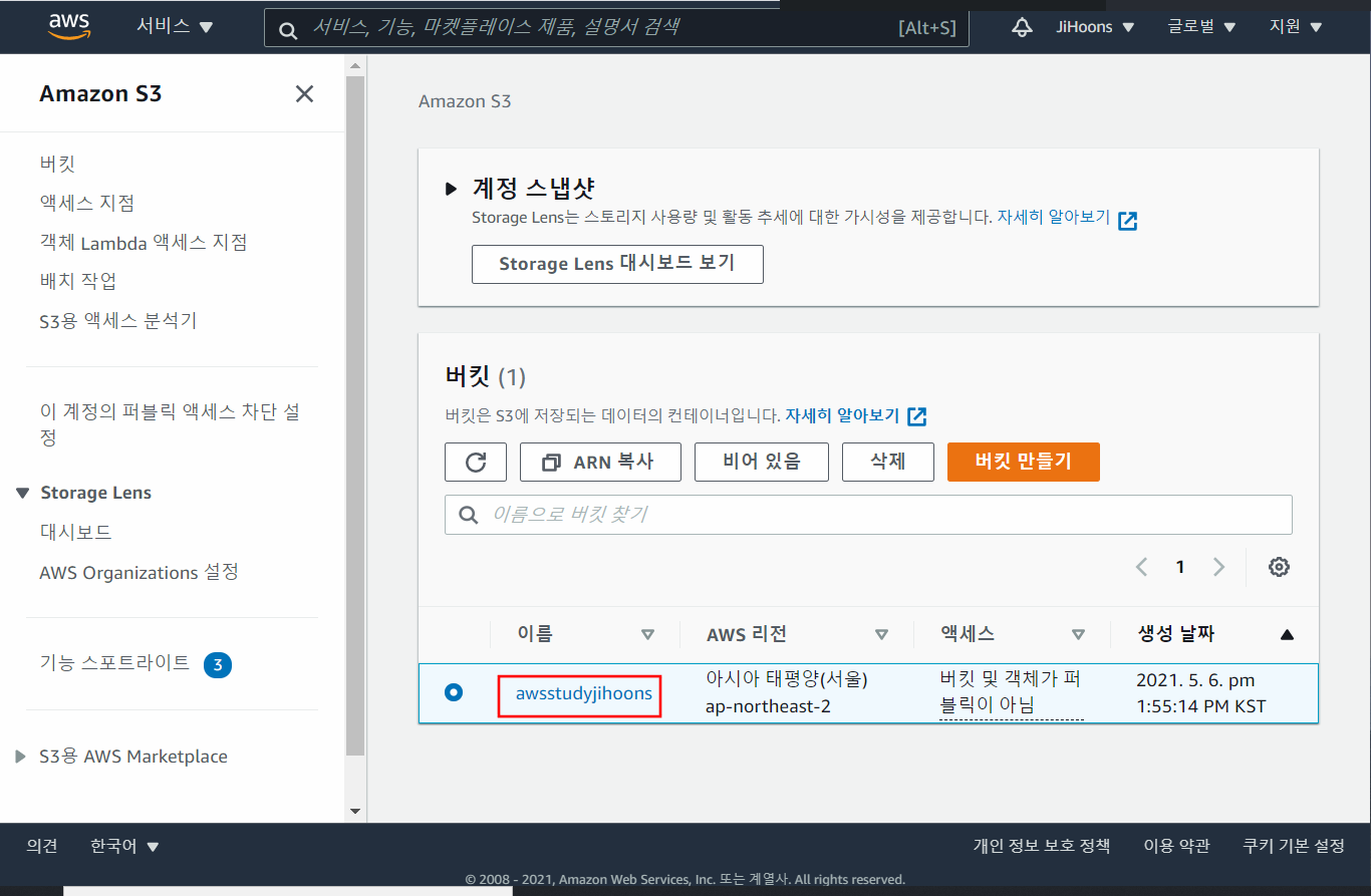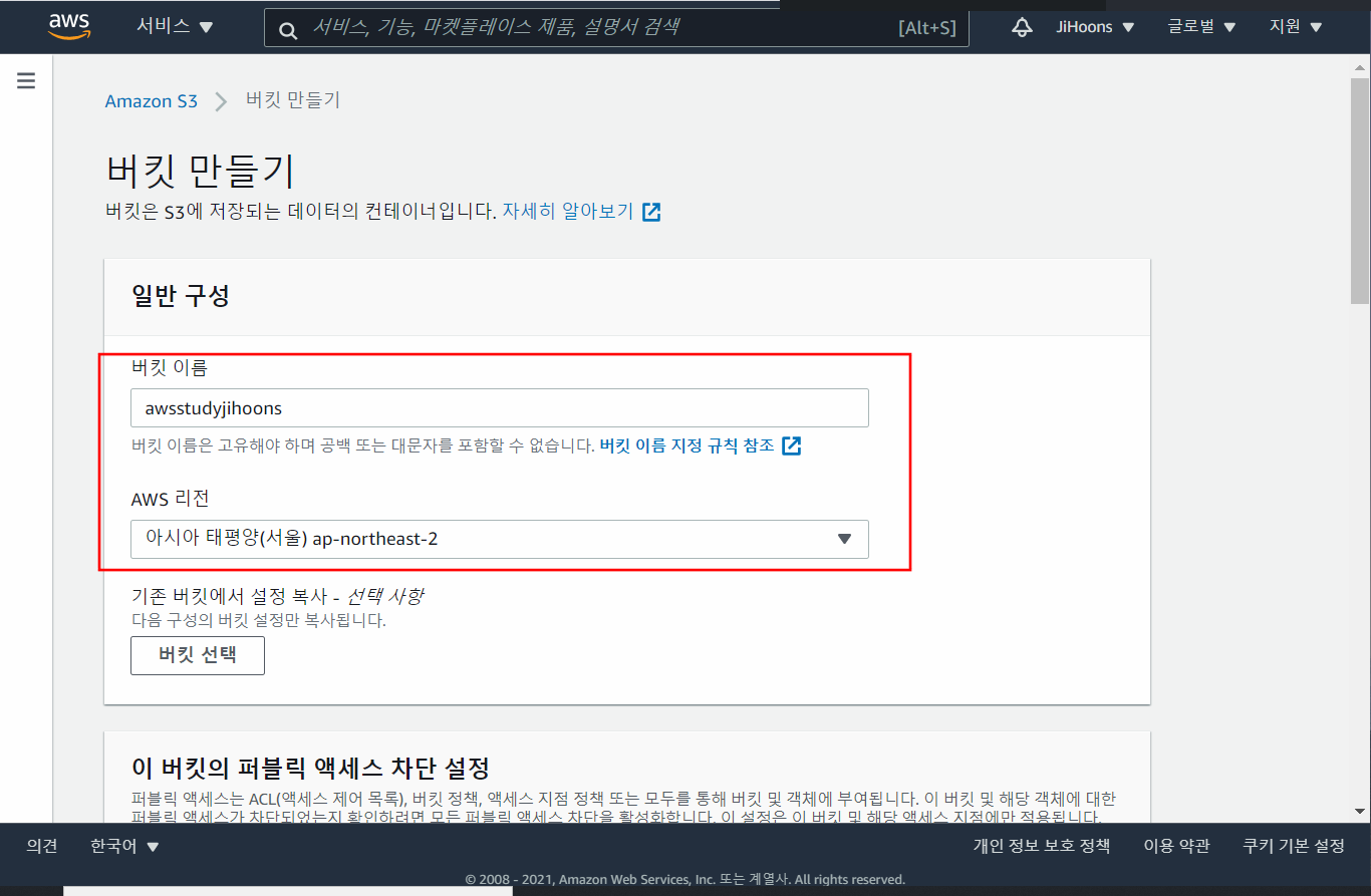 버킷이름 아무거나 해주고 리전을 설정해준다. 그리고 맨 밑으로 내려서 버킷만들기 클릭