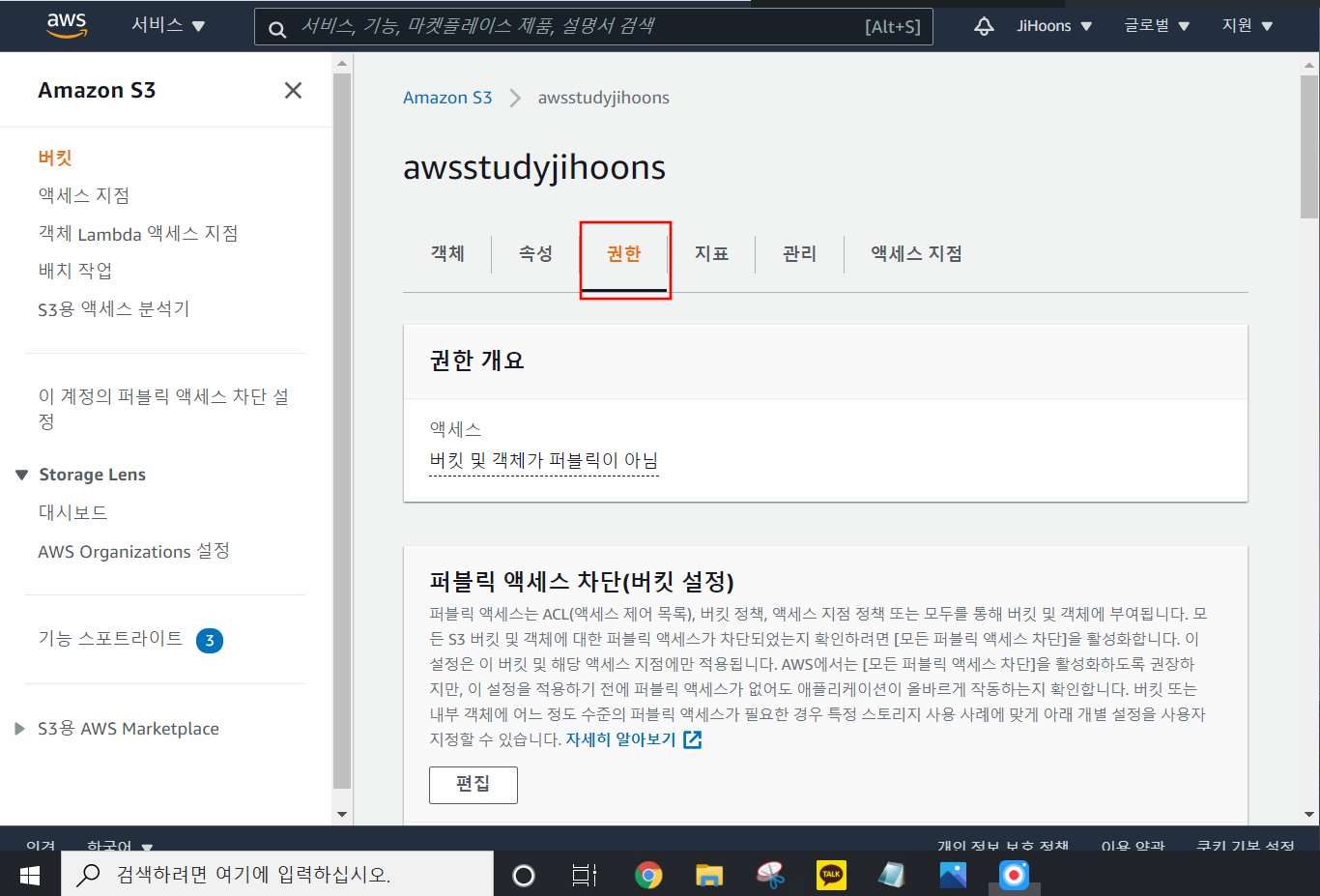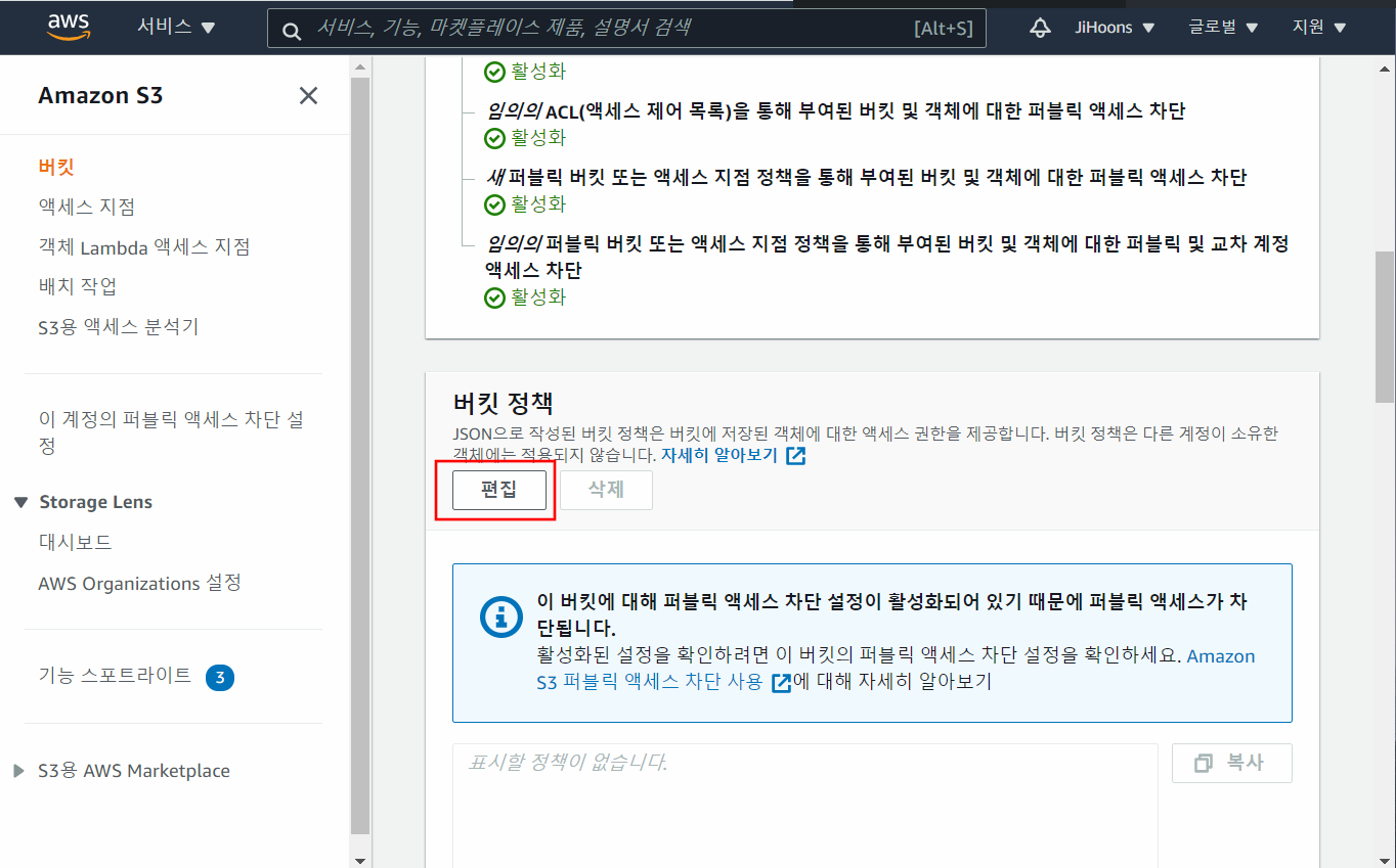 밑으로 내리면 버킷 정책이 있다. 편집 클릭
