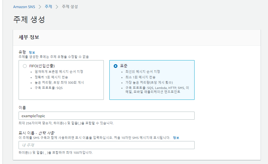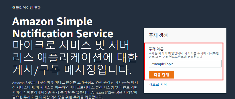 SNS서비스에 들어가서 새로운 토픽이름을 정하고 다음 단계를 누른다.