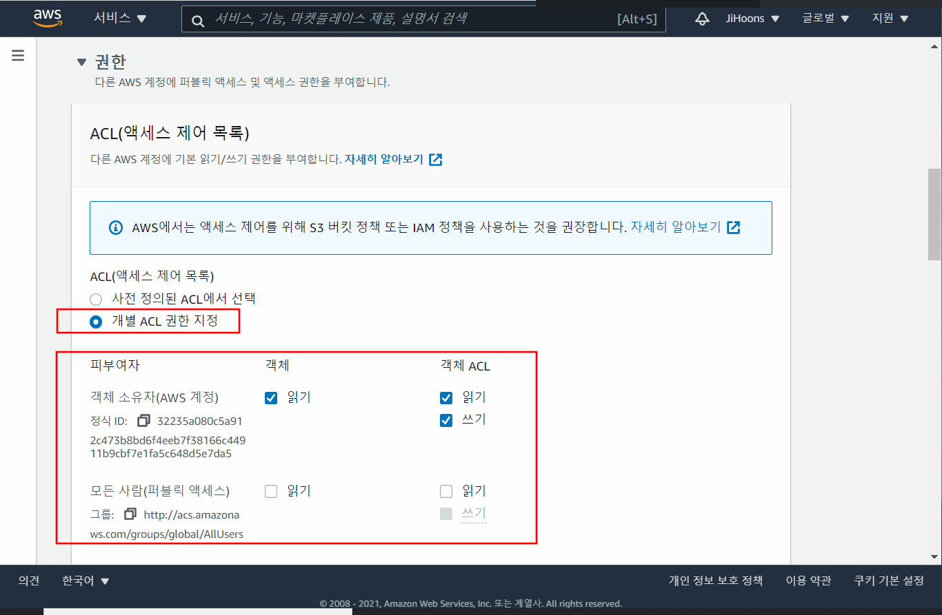 또한 파일에 대한 권한을 설정할 수 있다. 기본값은 사전 정의된 ACL에서 선택이고