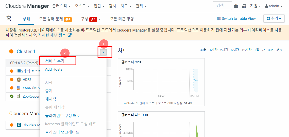 클라우데라 매니저에 접속한 다음 아래와 같이 클릭한다.
