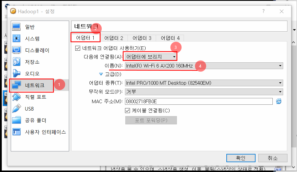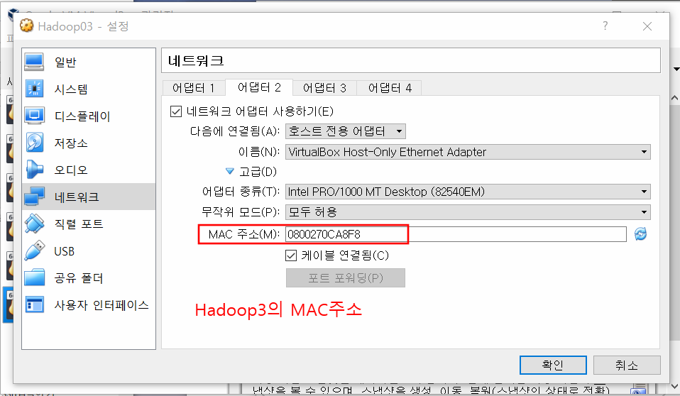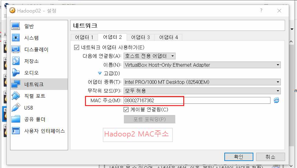 어댑터2부분도 아래처럼 해준다. 이따가 MAC주소는 쓰일 때가 있다.