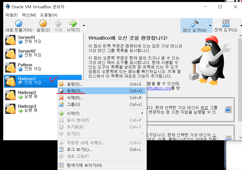 먼저 버추얼박스에 Hadoop1이란 리눅스 centos 7버전의 서버를 만든다.
