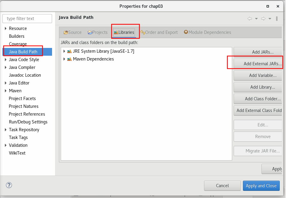 다 되면 프로젝트 이름 우클릭 - properties - java bulid path - libraries - add external jars 를 누른다.