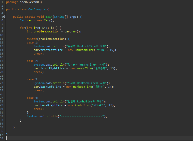 리턴된 타이어의 위치값은 problemLoction 변수에 저장되고 스위치 문을 통해서 새로운 타이어로 교체된다.