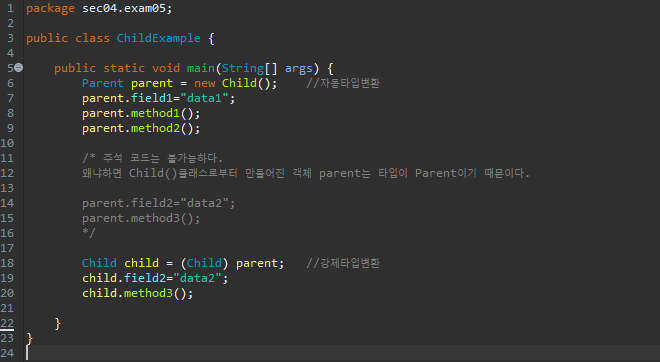 만약 자식에 선언된 필드와 메소드를 사용하려면 강제 타입 변환을 다시 한다음에 사용할 수 있다.