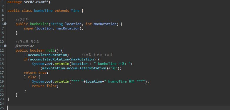 자동차가 달리면 각 타이어의 roll() 메소드가 실행되고 누적회전수가 증가되면서 최대회전수가 되면