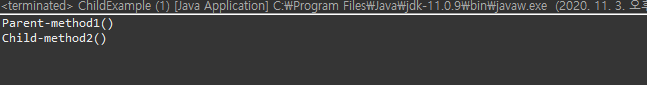 다만 method2()는 자식 클래스에서 재정의되었으므로 재정의된 메소드가 실행된다.