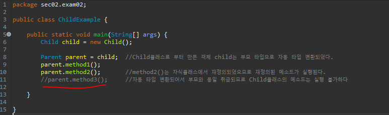 method3()는 자식클래스에서만 정의했으므로 현재 부모 타입에서는 사용 불가하다.