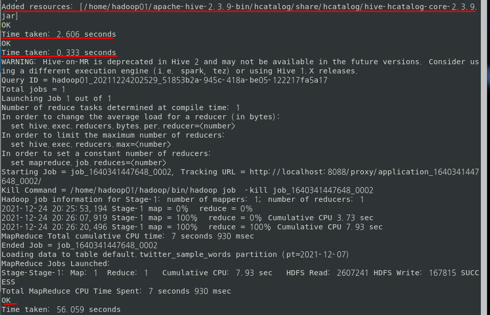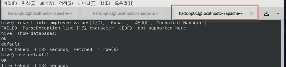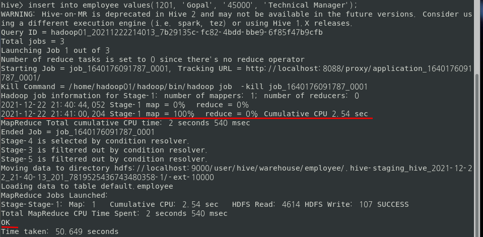 아래와 같이 Insert 문을 실행시키면 하둡의 맵리듀스가 실행된다.