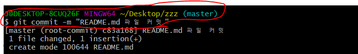 git commit -m "message" 명령어를 통해 README.md 파일에 대한 메시지를 입력하고 Local Repository로 보냅니다.