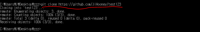 git clone github.com/JiHooney/test123 명령어로 원격 저장소에 있는 모든 파일들을 자신의 작업 디렉터리로 가져오는 것입니다. 이 명령어를 실행하면 작업디렉터리에 아래 사진과 같이 생기게 됩니다.