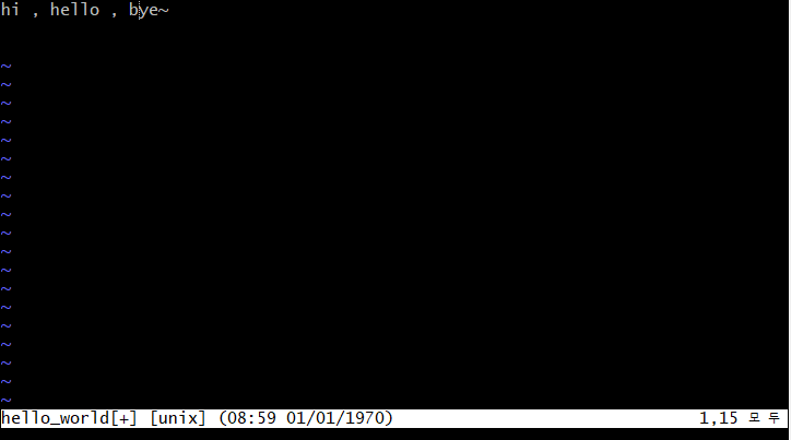 아래와 같은 화면이 뜨면 i 를 눌러서 파일내용을 편집하고 "hi hello bye~"입력한다.