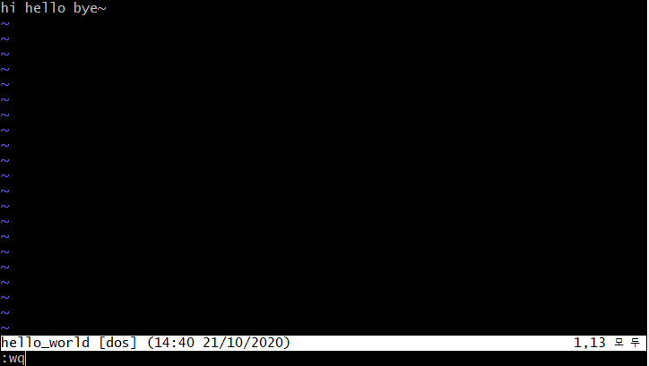 그리고 esc를 누르고 shift+; (: 콜론)을 누르면 맨 밑에 커서가 생기고 wq를 입력하고 엔터를 친다.
