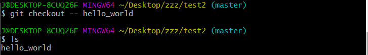 git checkout -- hello_world 명령어를 통해 로컬저장소에 저장된 파일을 다시 워킹디렉터리로 가져온다.
