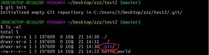 git init 명령어를 통해 .git 파일을 만들어주고 .git이 잘 생성되었는지 확인한다.